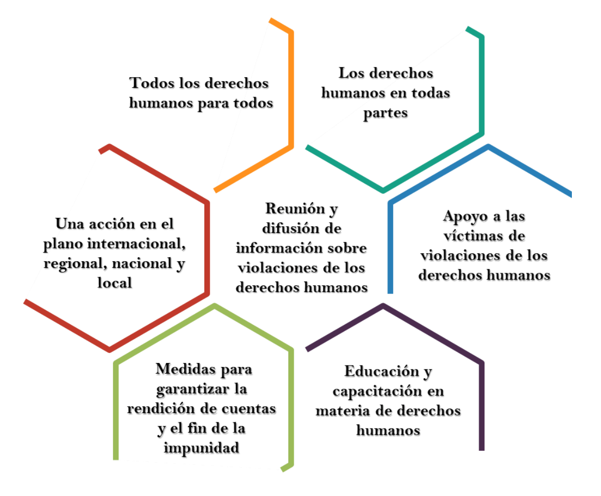 acciones se basan en la aplicación de los estándares internacionales de derechos humanos y sus valores intrínsecos, así como en su universalidad y en la vigencia del Estado de derecho conforme a estos estándares. La imparcialidad nos ofrece el marco de actuación en el cual buscamos establecer canales de comunicación e interrelación efectivos entre los actores institucionales y no gubernamentales, y entre estos y los mecanismos internacionales de protección de derechos humanos.